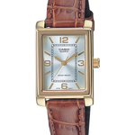 Casio LTP-1234PGL-7A - Women's elegant gold rectangular watch with brown leather strap. Elegant analogue watch from the Casio Collection featuring a slim rectangular case with a luxurious gold ion-plated finish. The classic silver dial is detailed with gold-tone hands and hour markers, creating a sophisticated vintage-inspired look. Fitted with a high-quality brown genuine leather strap for a comfortable fit and protected by scratch-resistant mineral glass. Water resistant to minor splashes and rain, making it a stylish choice for daily wear. Each watch is delivered in its original Casio packaging, ensuring authenticity and quality.