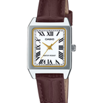 Casio LTP-B150L-7B2EF - Women's elegant silver square watch with brown leather strap. Sophisticated analogue watch from the Casio Timeless Collection featuring a chic rectangular stainless steel case in a polished silver tone. The classic white dial is adorned with black Roman numeral hour markers and simple hands, creating a refined vintage-inspired look. Fitted with a genuine brown leather strap for lasting comfort and style, and protected by scratch-resistant mineral glass. Water resistant to 3 ATM (30 m), offering protection against incidental splashes and rain. Each watch is delivered in its original Casio packaging, ensuring authenticity and quality.
