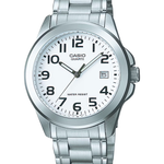 Casio MTP-1259PD-7BEG - Men's classic silver analogue watch with white dial. Classic analogue watch from the Casio Collection featuring a simple and elegant design with a round silver-tone ion-plated case. The clean white dial is detailed with contrasting black Arabic numerals and luminous hands for optimal readability, accompanied by a practical date window at the 3 o'clock position. Fitted with a durable stainless steel bracelet and scratch-resistant mineral glass for everyday resilience. Water resistant to 3 ATM (30 m), offering protection against water splashes and rain. Each watch is delivered in its original Casio packaging, ensuring authenticity and quality.