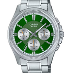 Men's analogue watch from the Casio Collection featuring an ion-plated case and stainless steel bracelet with one-touch 3-fold clasp for a striking, sophisticated look. The bold green dial with three-hand movement (hour, minute, second) and three inset dials displaying day, date, and 24-hour time offers comprehensive functionality with classic style. Substantial at 129 g with mineral glass and 5 ATM (50 m) water resistance, paired with a 3-year battery life, ideal for business and smart-casual wear. Each watch is delivered in its original Casio packaging, ensuring authenticity and quality.