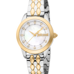 Introducing the Just Cavalli Aurora Female Watch JC1L331M0065, a stunning timepiece that seamlessly combines elegance and modernity. This exquisite watch features a two-tone case crafted from silver and gold, exuding sophistication and charm. The striking white mother-of-pearl dial complements the luxurious hue of the case, ensuring that this watch stands out in any setting.