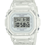 Women's digital watch from the Casio Baby-G Urban Style collection featuring a clear white resin case and a matching clear white resin strap for a fresh, modern look. The easy-to-read digital display shows time, date, and day of the week with LED backlight for visibility in low light. Practical features include a 1/100-second stopwatch, countdown timer, 5 daily alarms with hourly signal, automatic full calendar, and 12/24 - hour time format. Built with shock-resistant construction and water resistant up to 10ATM (100m), suitable for swimming and everyday activities.