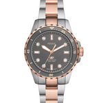 The Fossil Blue Dive ES5348 watch is an elegant fusion of sporty and classic design. Featuring a 36 mm stainless steel case with a sleek silver finish, it is paired with a two-tone rose gold and silver stainless steel strap, adding a refined touch. The gray dial with luminescent hands and hour markers enhances readability, while crystal accents on the dial add a touch of sparkle.