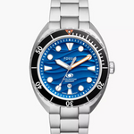 The eye-catching blue dial is accented with bold, luminous hands and markers, ensuring optimal readability. The wave-patterned dial adds a dynamic element, while the date window at the 6 o’clock position enhances functionality.