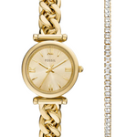 The Fossil Carlie ES5387SET is an embodiment of elegance and luxury, designed for the modern woman who appreciates timeless accessories. This exquisite set features a watch and a matching bracelet, both crafted in a dazzling gold-tone finish.