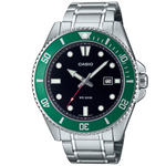 Casio MDV-107D-3AVEF – Robust Silver Case with Black Dial and Stainless Steel Bracelet with Green Bezel.