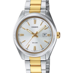 Women's analog watch featuring a brass case and a two-tone (silver and gold) stainless steel bracelet, combining Casio's classic design with everyday functionality. Equipped with a date display at the 3 o'clock position, luminous hands for enhanced readability in low-light conditions, and reliable quartz movement.