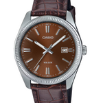 Men's analog watch featuring a polished brass case and brown leather strap, combining Casio's classic design with everyday functionality. Equipped with a date display at the 3 o'clock position and reliable quartz movement.