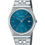 Unisex analog watch featuring a stainless steel case and bracelet, combining Casio's classic design with a vibrant ocean blue sunray dial. Equipped with a date display at the 3 o'clock position and reliable quartz movement.