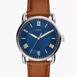 Fossil Copeland FS5661 – Elegant Silver Case with Blue Sunray Dial and Brown Leather Strap.