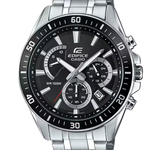 Men's analog chronograph watch from the Casio Edifice collection featuring a silver stainless steel case and matching stainless steel bracelet for a sleek, professional look. The black dial displays hour, minute, and second hands with luminous coating, along with a date window. Chronograph functions include a 1/1 second stopwatch with up to 30 minutes measurement capacity and split time. Protected by mineral glass, this durable timepiece is water resistant to 10-ATM (100m), suitable for swimming and everyday water activities.