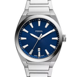 Men’s analog watch featuring a 44 mm silver-tone stainless steel round case with a fixed bezel and a matching three-link stainless steel bracelet (22 mm width) secured with a fold-over clasp. The blue dial includes silver-tone hour markers, silver-tone hands, and a discreet date window at 6 o’clock.