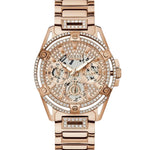 This stunning timepiece features a polished rose gold-tone stainless steel case and bracelet, beautifully accented with dazzling crystals that catch the light from every angle. The 40mm round case houses a richly detailed rose gold dial, enhanced with multi-function subdials and bold crystal embellishments for an unmistakably luxurious feel.