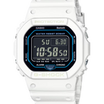 Men's digital watch featuring a white resin case and strap, combining G-Shock durability with a futuristic aesthetic. Equipped with Bluetooth connectivity for smartphone linking via the CASIO WATCHES app, enabling automatic time adjustment and easy setting of functions. Includes a 1/100-second stopwatch, countdown timer, 5 daily alarms, world time across 38 time zones, and a full auto-calendar.