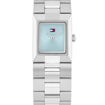 Tommy Hilfiger Ivy 1782797 - Elegant women’s watch featuring a 20 × 25 mm rectangular stainless-steel case and a matching integrated bracelet for a refined, jewelry-inspired look. The light-blue sunray dial has a minimalist design with silver hands and the Tommy Hilfiger flag at 12 o’clock. Powered by a reliable Japanese quartz movement and protected by a mineral crystal. Water resistant up to 3 ATM (30m), suitable for daily wear.