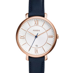 Fossil Jacqueline ES3843 – Elegant Rose-Gold Case with Silver Dial and Navy Leather Strap.