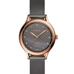 Fossil Laney BQ3393 – Elegant Rose-Gold Case with Mother-of-Pearl Dial and Gunmetal Mesh Bracelet.