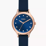 The Fossil Laney Three-Hand BQ3858 exudes a modern and minimalist charm, perfect for adding a subtle pop of color to any look. This women’s timepiece features a 34 mm round stainless steel case finished in rose gold, giving it a warm and sophisticated appeal. The blue dial stands out with its simple design, adorned with polished dot hour markers that add a touch of elegance.