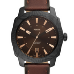 The Fossil Machine FS5972 is a bold and rugged timepiece designed for the modern man who values both style and durability. This men's watch features a substantial 49 mm round stainless steel case with a black finish, giving it a robust and industrial aesthetic. The brown dial with rose gold-tone hands and indices adds a sophisticated contrast, enhancing its masculine appeal.