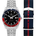 Lucien Rochat Men's watch, ref.; R0423117003, LMAN Collection, special pack with stainless steel and fabric strap, automatic movement, automatic function.; The watch features two interchangeable straps: made of steel and fabric.; The watch case measures 43mm, surrounds a black dial and features a durable sapphire crystal.; Water resistance up to 10 ATM.; The watch is shipped in its original Lucien Rochat packaging, with a 2-year warranty.