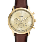 Fossil Neutra FS6113 – Refined Gold-Tone Men’s Chronograph Timepiece. Men’s analog watch featuring a 44 mm gold‑tone stainless steel round case and a champagne sunray dial equipped with chronograph subdials and a date window. Driven by a Japanese quartz chronograph movement (JS25) offering precise timekeeping, stopwatch, 24-hour, and small seconds functions. Strap: 22 mm genuine brown leather with single‑prong buckle; interchangeable. Protected by mineral crystal and water‑resistant to 50 m (5 ATM), ideal for everyday use and light water exposure. Case dimensions: 44 mm × ~11 mm thickness. Each watch arrives in original Fossil packaging ensuring authenticity and warranty.