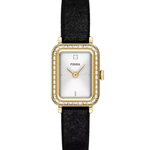 Female analog watch featuring a gold-tone stainless steel rectangular case and black velvet fabric strap, with a silver sunray dial inspired by contemporary fashion.