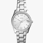 The Fossil Scarlette ES4317 is a stylish and elegant women's watch that combines modern sophistication with classic charm. Featuring a 32 mm round stainless steel case, this timepiece is adorned with a dazzling crystal-encrusted bezel, adding a touch of glamour to any outfit. The silver dial is accented with Roman numeral hour markers, giving it a refined, timeless appeal.