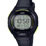 Casio LW-203-1BVEF - Women's black digital watch with long battery life. Sporty digital watch from the Casio Collection featuring a compact black resin case and a matching curved resin strap for a comfortable, ergonomic fit. The clear digital display is protected by a stylish spherical glass and features an LED backlight for visibility in dark conditions. Equipped with practical functions including dual time, a 1/100-second stopwatch, a daily alarm, and a full auto-calendar. Powered by a high-capacity battery offering up to 10 years of operation. Water resistant to 5 ATM (50 m), suitable for swimming and daily wear. Each watch is delivered in its original Casio packaging, ensuring authenticity and quality.