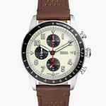 This rugged yet refined timepiece embodies the spirit of adventure, featuring a robust stainless steel case paired with a genuine brown leather strap. The classic round dial, presented in a crisp white hue, is thoughtfully designed with contrasting black subdials and bold numerals for a striking aesthetic. The tachymeter bezel adds a sporty touch, while the red chronograph hand enhances precision and style.