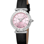 Female fashion watch featuring a 28 mm round stainless-steel case with a light-pink dial protected by mineral crystal.