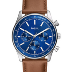 Fossil Sullivan BQ2857 – Stylish Blue-Dial Multifunction Men’s Timepiece. Men’s analog watch featuring a 44 mm stainless steel round case with a vibrant blue sunray dial and brown LiteHide™ leather strap (22 mm width) with double‑prong buckle; strap is interchangeable. Driven by a quartz multifunction movement offering reliable day, date, and 24‑hour subdials. Protected by mineral crystal and water‑resistant to 50 m (5 ATM), suitable for everyday wear and light water exposure. Case thickness: approximately 9 mm. Each watch is delivered in original Fossil box, ensuring authenticity and warranty.