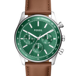 Featuring a 44 mm round stainless steel case in a sleek silver tone, this watch is complemented by a green dial with multifunction subdials and a tachymeter scale, adding both style and functionality. The durable mineral crystal window ensures clear visibility and protection against scratches.