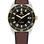 Men’s automatic watch featuring a 40 mm stainless-steel case, a black dial with luminous hands and indices, and a brown leather/silicone hybrid strap for sporty comfort. Powered by a 21-jewel automatic movement with approximately 40 hours of power reserve. Dial protected by mineral crystal. Water resistant to 10 ATM (100 m), suitable for swimming.
