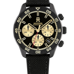 Sporty chronograph watch with a 42 mm case made of carbon fiber reinforced polymer and a black textured Cordura strap lined with silicone for durability and comfort. The black dial features gold-tone subdials, a date window, and three-hand timekeeping with a quartz movement. Protected by a mineral crystal and water resistant up to 5 ATM (50 m), suitable for everyday wear.