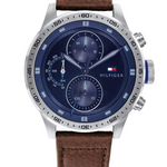 Men’s analog chronograph watch with a 4 mm stainless-steel case, a deep blue dial that features subdials for day, date, and 24‑hour time, and bold silver-tone hands. Paired with a genuine brown leather strap for a refined yet casual look.
