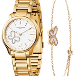Complementing the watch is a matching bracelet, making this set perfect for any occasion. The secure steel strap ensures comfort, and the gold case adds a luxurious touch.